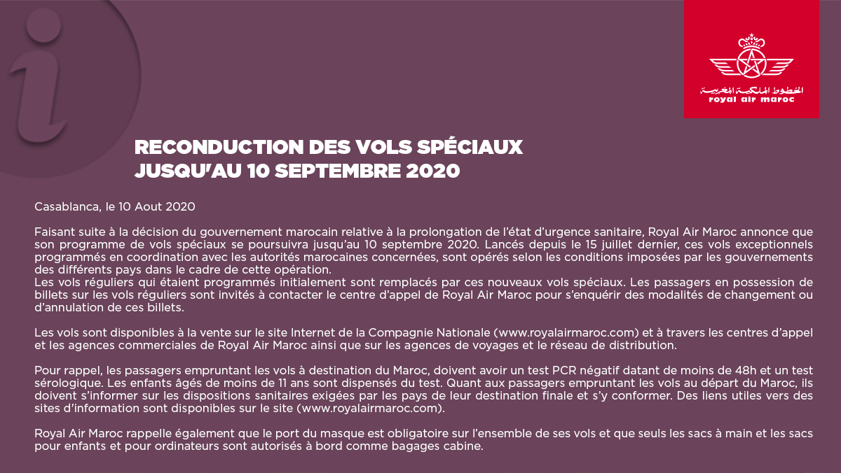 Royal Air Maroc On Twitter Royal Air Maroc Poursuit Son Programme De Vols Speciaux Jusqu Au 10 Septembre 2020