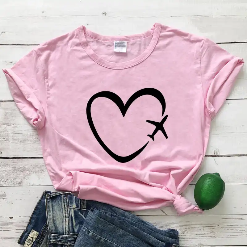 Camiseta Con Diseno De Avion Y Corazon Para Mujer Remera Con Grafico De Vacaciones Playera Informal De Manga Corta Para Viaje Ropa De Calle Camisetas Aliexpress