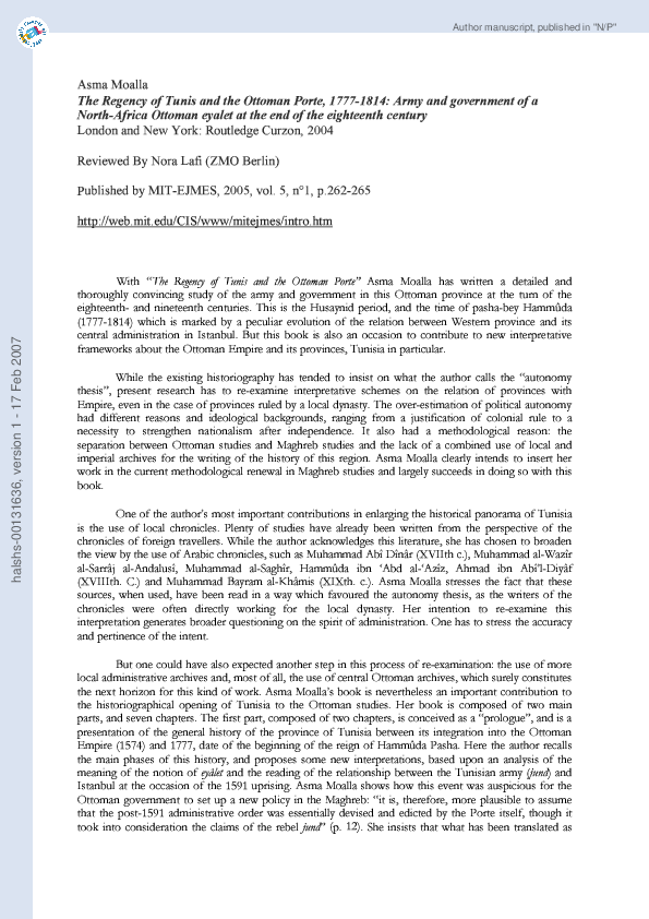 Pdf Review Of Asma Moalla The Regency Of Tunis And The Ottoman Porte 1777 1814 Army And Government Of A North Africa Ottoman Eyalet At The End Of The Eighteenth Century Nora Lafi