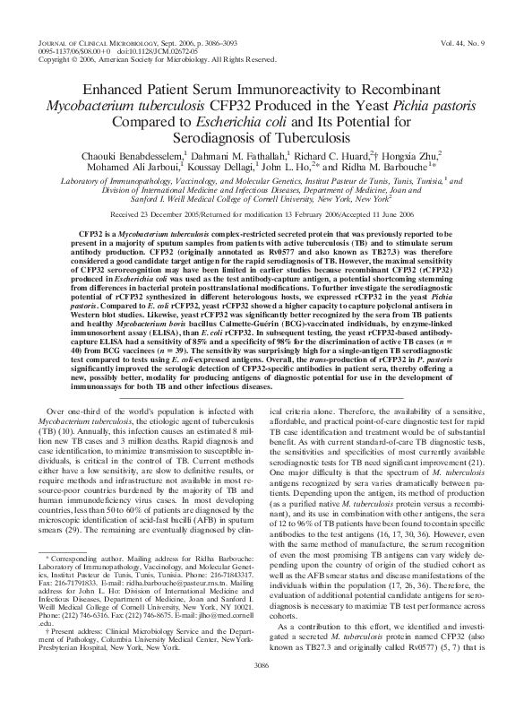 Pdf Enhanced Patient Serum Immunoreactivity To Recombinant Mycobacterium Tuberculosis Cfp32 Produced In The Yeast Pichia Pastoris Compared To Escherichia Coli And Its Potential For Serodiagnosis Of Tuberculosis Koussay Dellagi Academia Edu
